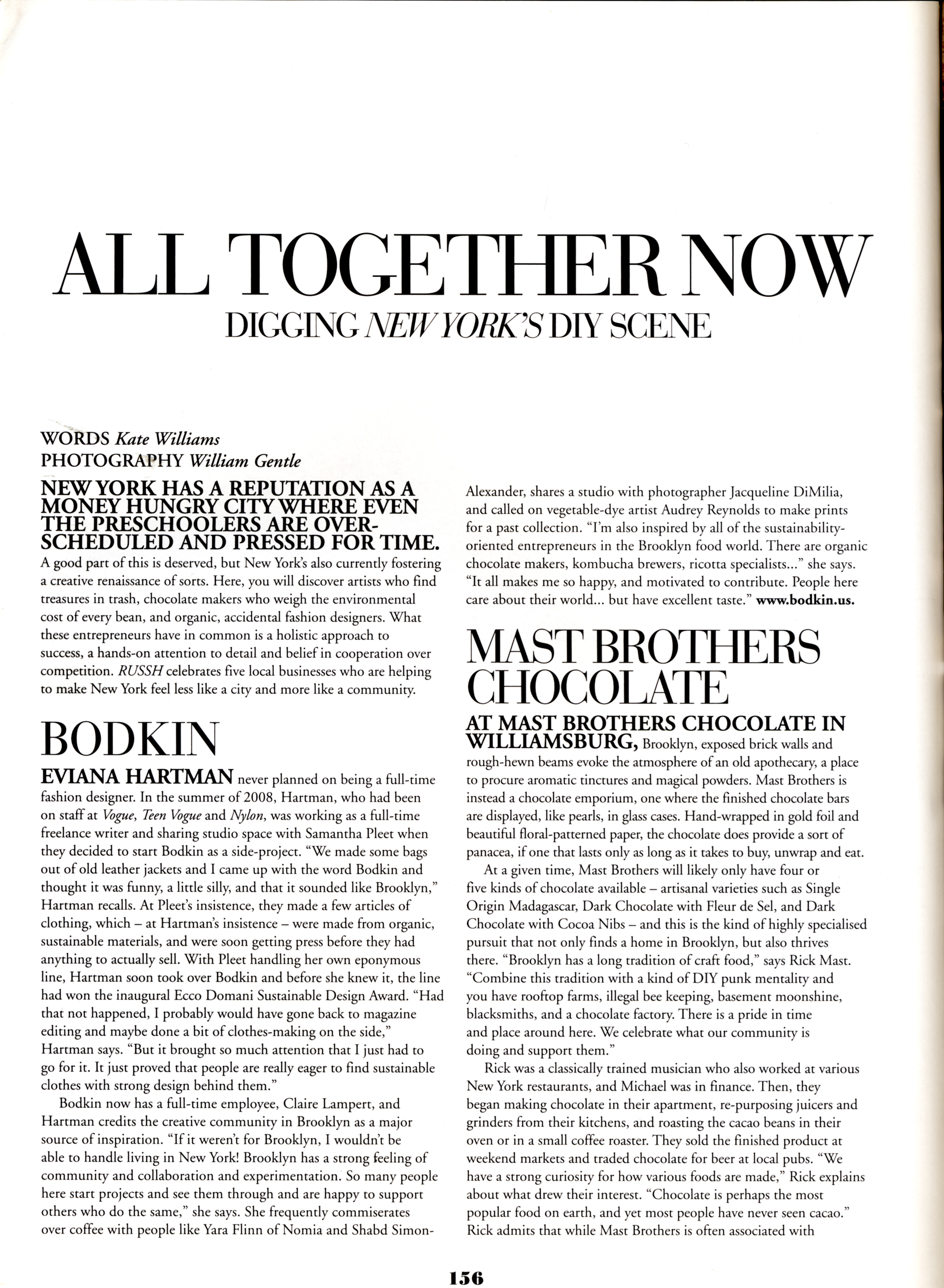 New York may have a reputation as a place where even pre-schoolers are overscheduled and pressed for time. A good part of this is deserved, but New York's also currently fostering a creative renaissance of sorts. Here, you will discover artists who find treasures in trash, chocolate makers who weigh the environmental cost of every bean, and organic, accidental fashion designers. What these entrepreneurs have in common is a holistic approach to success, a hands-on attention to detail and a belief in cooperation over competition. RUSSH celebrates five local businesses who are helping to make New York feel less like a city and more of a community.