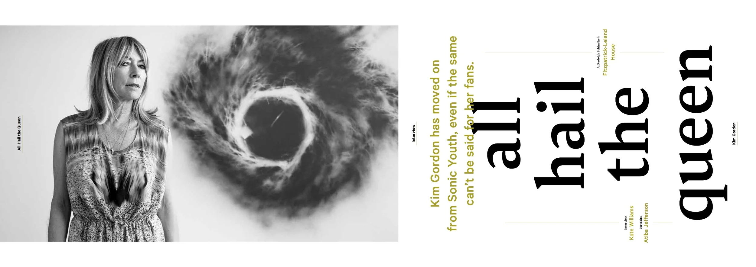 Still following here? Ok, good, because this interview with Kim Gordon happened just a couple of weeks after that. Gagosian Gallery was presenting an exhibition called “Coming Soon,” a series of 24 paintings that Gordon did working as Design Office. The exhibition took place at Rudolf Schindler’s Fitzpatrick-Leland House, a starkly beautiful minimalist home in the Laurel Canyon hills above Los Angeles. I arrive early for the interview, and in chatting with the director overseeing the show, I mistakenly say the two words he, as a gallerist arranging interviews about Kim Gordon’s paintings, probably doesn’t want to hear: Sonic Youth. That, he politely but firmly tells me, is not what this interview is about.
