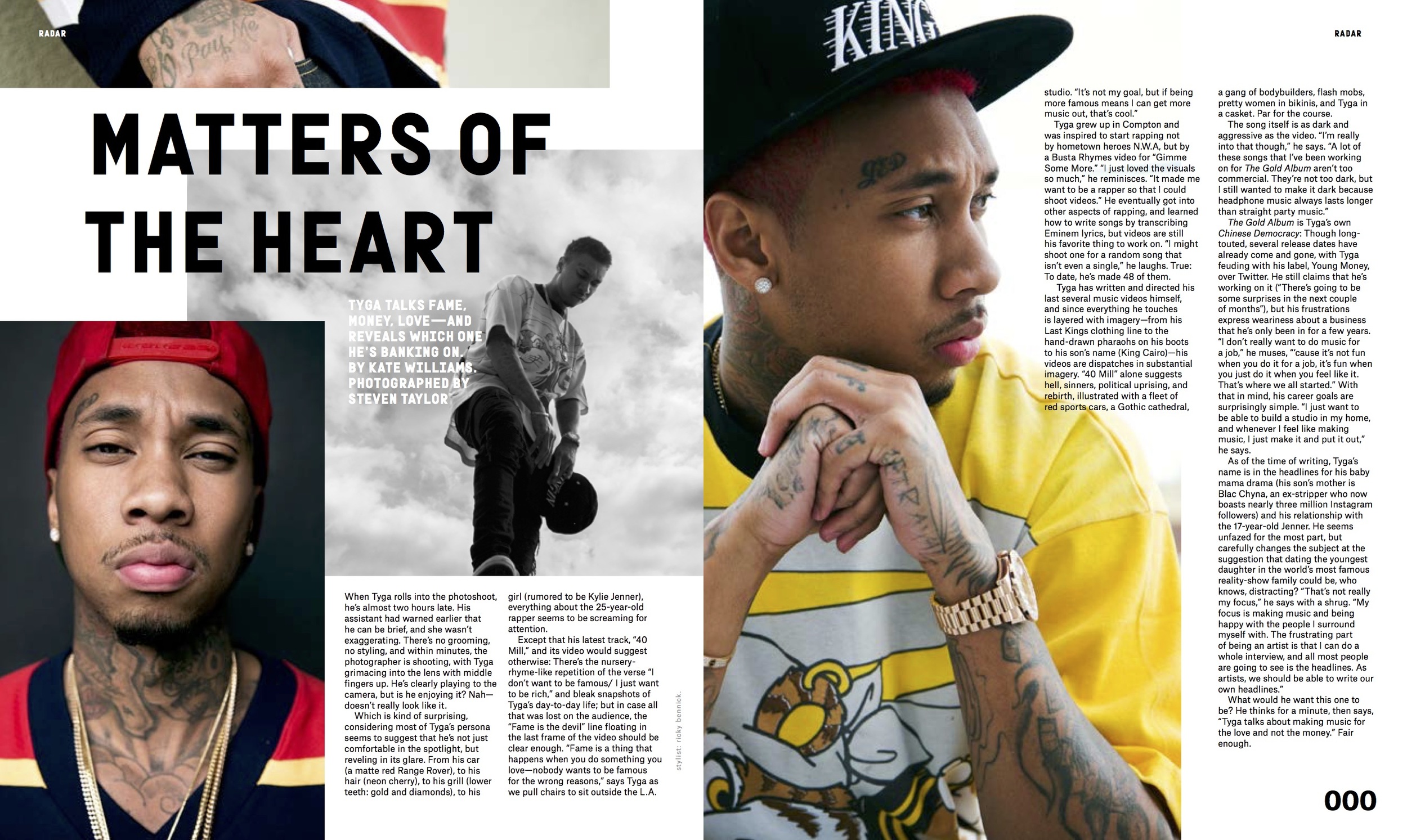 As of the time of writing, Tyga’s name is in the headlines for his baby mama drama (his son’s mother is Blac Chyna, an ex-stripper who now boasts nearly three million Instagram followers) and his relationship with the 17-year-old Jenner. He seems unfazed for the most part, but carefully changes the subject at the suggestion that dating the youngest daughter in the world’s most famous reality-show family could be, who knows, distracting? “That’s not really my focus,” he says with a shrug. “My focus is making music and being happy with the people I surround myself with. The frustrating part of being an artist is that I can do a whole interview, and all most people are going to see is the headlines. As artists, we should be able to write our own headlines.” What would he want this one to be? He thinks for a minute, then says, “Tyga talks about making music for the love and not the money.” Fair enough.